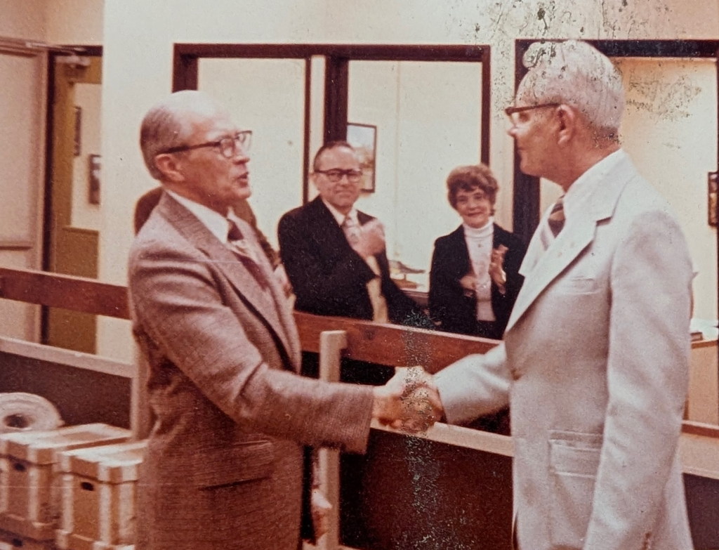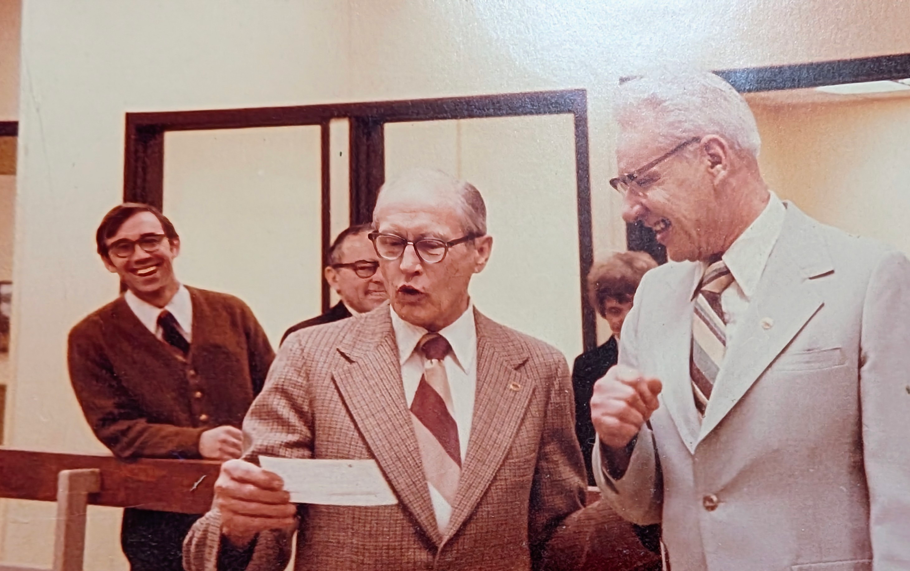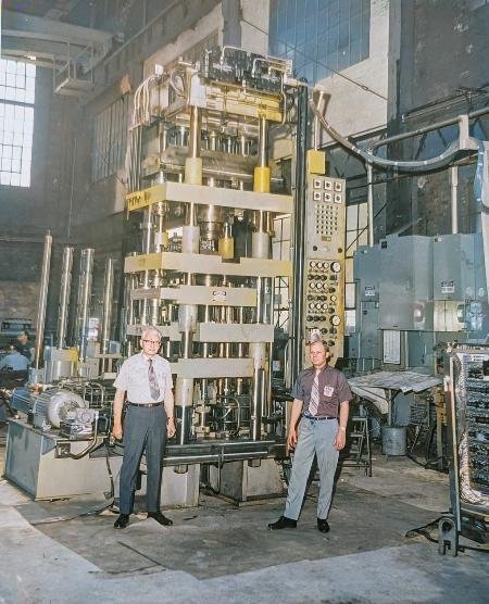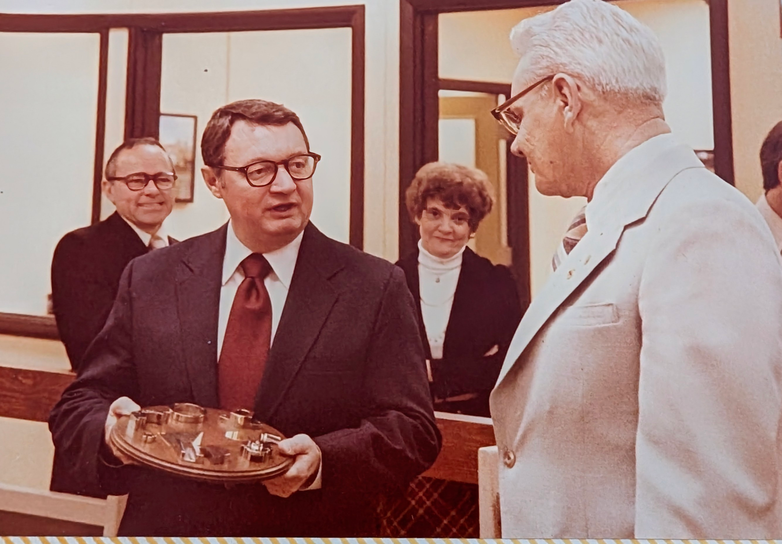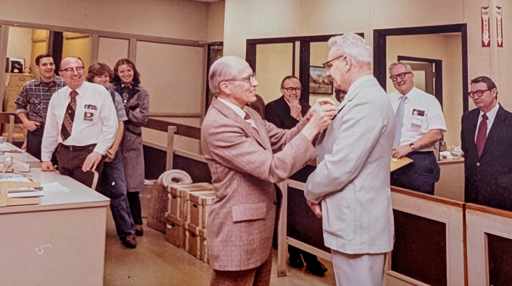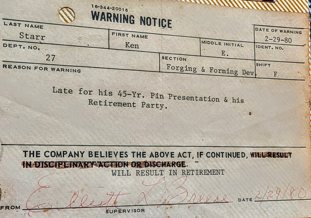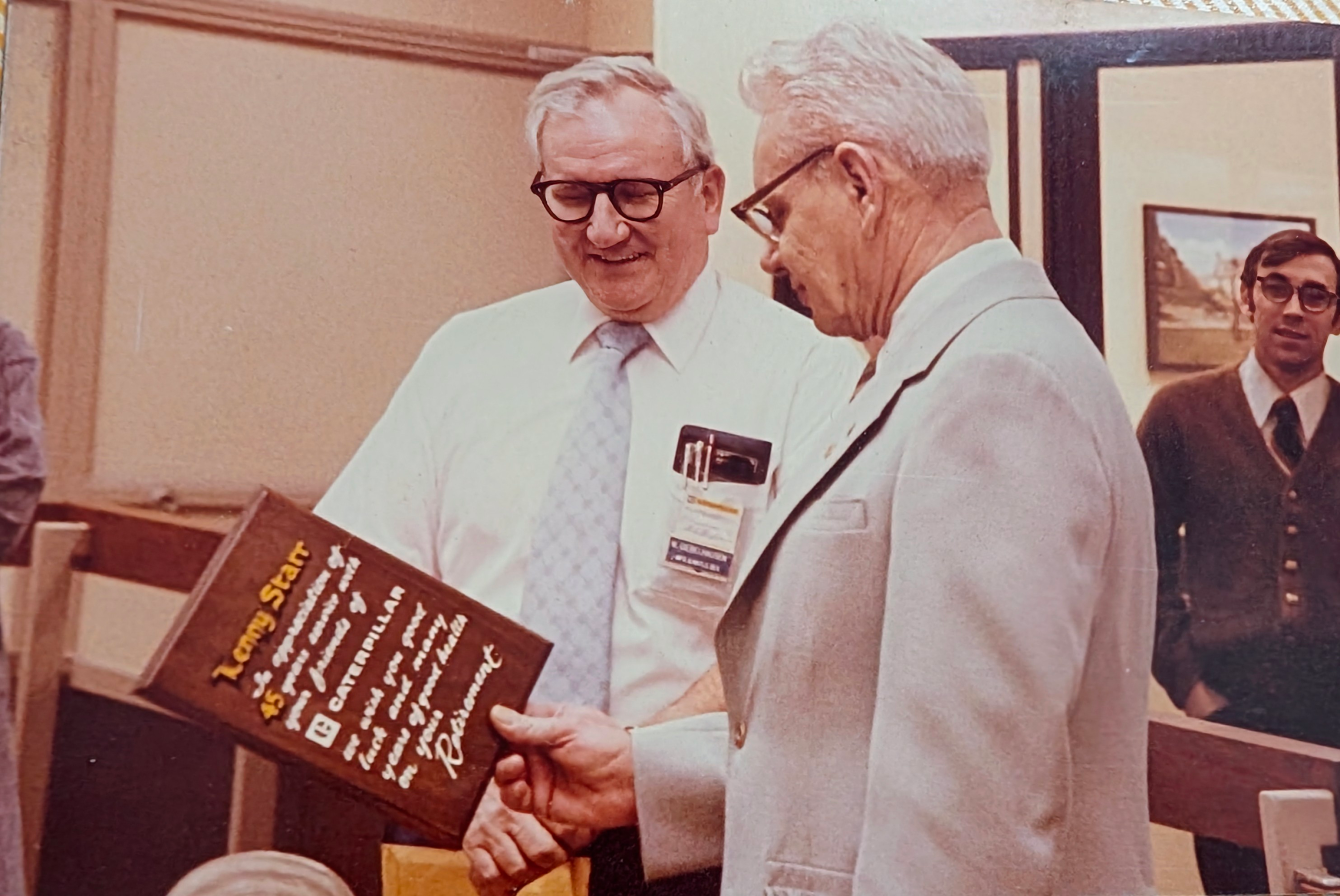 The photo depicts Grandpa (on the left hand side) standing in front of a machine two stories high in 1971. Dad told me it was a powdered metal press for stamping parts for the various machines they built at Caterpillar Tractor Company. Grandpa (Ken E Starr) helped design this machine and many others. Previously they had poured molten metal from a foundry into molds to make parts. With this machine they could stamp directly into the metal and then once a chemical was sprayed on it became strong as steel. Every piece on every machine they made was made in the Peoria area. Dad said this picture was taken at the old foundry building. They turned it into a space to design machines. Grandpa worked in the Forging and Forming Design section of the Caterpillar East Peoria Factory as what would now be called a mechanical design engineer. He didn’t attend university; he learned on the job, starting at Caterpillar as an apprentice machinist just like my Dad. He retired after working for Caterpillar for 45 years from 1936 to 1981. The photos below are from his retirement party. The last photo is a collection of things the machines he designed over the years created.