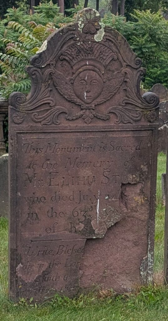 Elihu Starr, son of Elihu and Mary Birdseye Starr is buried next to his grandfather’s table monument. Elihu Jr lived to be age 28 yrs, dying in March of 1784. There’s no indication he was ever married.