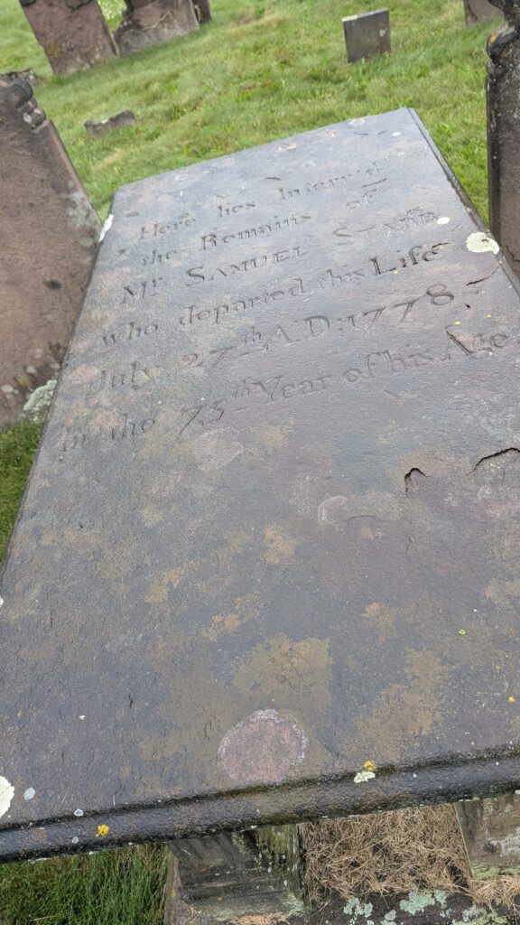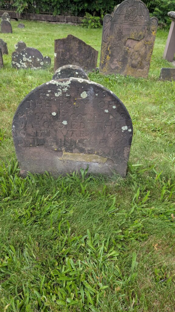 This one really surprised me. The stone says “Here lies the body of Sam Collins who died 10 January 1696 being in the 60 year of his age.”