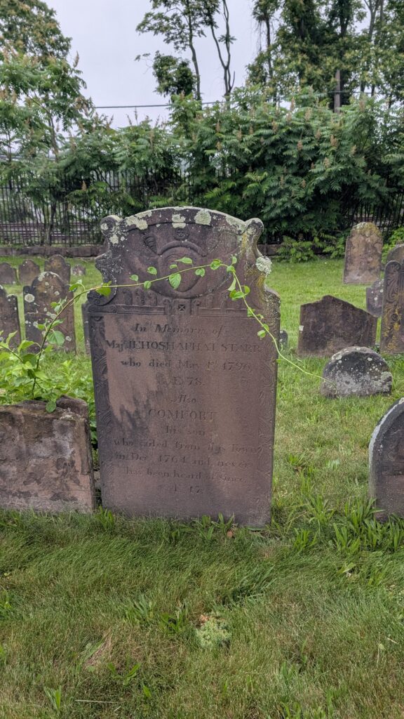 The above memorial was for Major Jehoshaphat Starr my 7x great granduncle (Thomas brother) and his youngest son Comfort, who was lost at sea. Jehoshaphat Sr. was the youngest surviving son of Joseph Sr and Abigail Baldwin Starr. His home is now part of Wesleyan University in Middletown and there’s a historic marker telling about him and his wife. Major Starr served in the French and Indian War and worked as a tailor. He bought the house that was once owned by the first minister of Middletown and it still stands. Benjamin Franklin’s Tory son William, the last royal governor of New Jersey was seized for his Tory activities, and Governor Franklin spent nearly a year under house arrest at the Starr home.