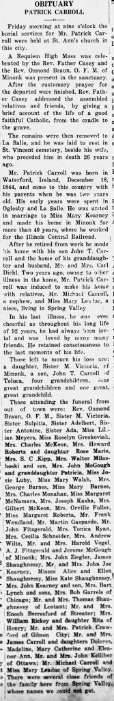In Patrick Carroll’s obituary in 1937 there is a long list of relatives who came to pay their respects, including some more Kearneys. Mr and Mrs. John Joe Kearney, and Mrs. John Kearney and son. A long list of Shaughnessy’s attended, these are the family of Mary’s sister Margaret. Margaret married David Shaughnessy in 1865 in LaSalle. David farmed in McLean County in places like Chenoa, Yates and Anchor before retiring in Chicago.