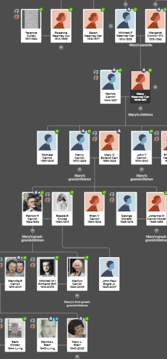 My maternal grandfather’s grandmother was Mary Kearney. She married Patrick Carroll in La Salle, Illinois in 1866 when she was 20 years old. Her married name then, was Mary Carroll, the same as my own mother’s given name. But finding her origins has been a bit of a journey.
