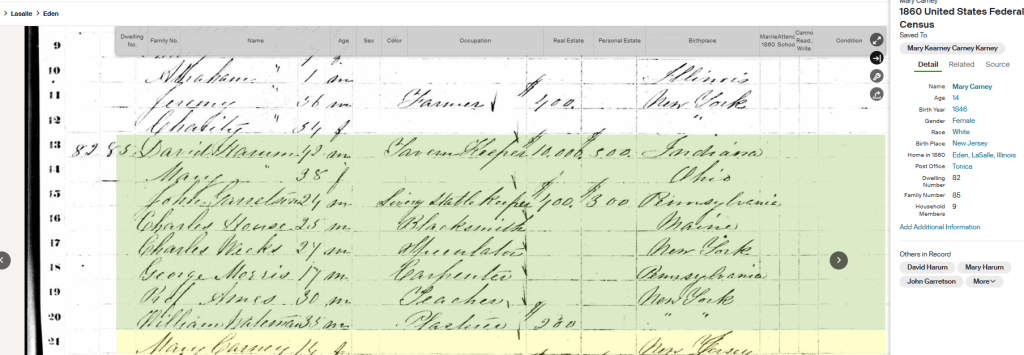 So Patrick and Margaret fled Ireland in 1842 to find a better life but by 1860 the family is no longer together. Mary is 14, living in the town of Eden, LaSalle County, Illinois in a tavern containing 8 adults from places ranging from Maine to NY to Pennsylvania to Indiana and Ohio, in occupations like blacksmith, carpenter, teacher, plasterer and livery stable keeper. Her sister Margaret is listed as 12, also living in Eden, in the house of Mahan and Alice Hanley and 6 other workers from Ireland and Denmark.