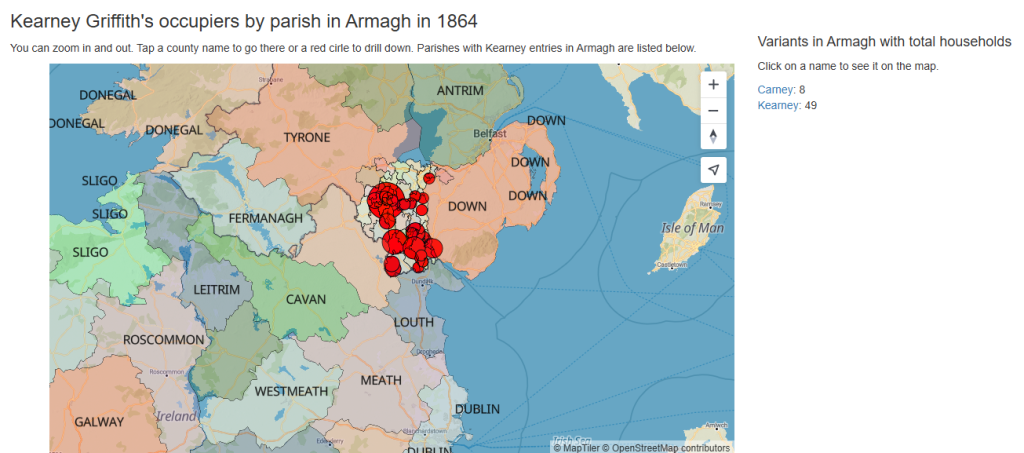 **A fun aside here. Barack Obama is descended from Kearneys in County Offaly, Ireland in the 1700s. Theoretically the Kearney family is descended from Milesius, King of Spain through the line of his son Heber, the first King of Munster in A.D. 177 Cormac Cas and Sabia, daughter of Con of the Hundred Battles, King of Ireland A.D. 148. The ancient name was Cearnach, signifying “Victorius” taken from a chief called Cartharnaigh. This chief was from Counties Meath and Westmeath and designated O’Caharney of the battling arms. This became O’Kearney. Here’s a map showing the location of Kearneys in Armagh in 1864, about 20 years after our Kearneys left.