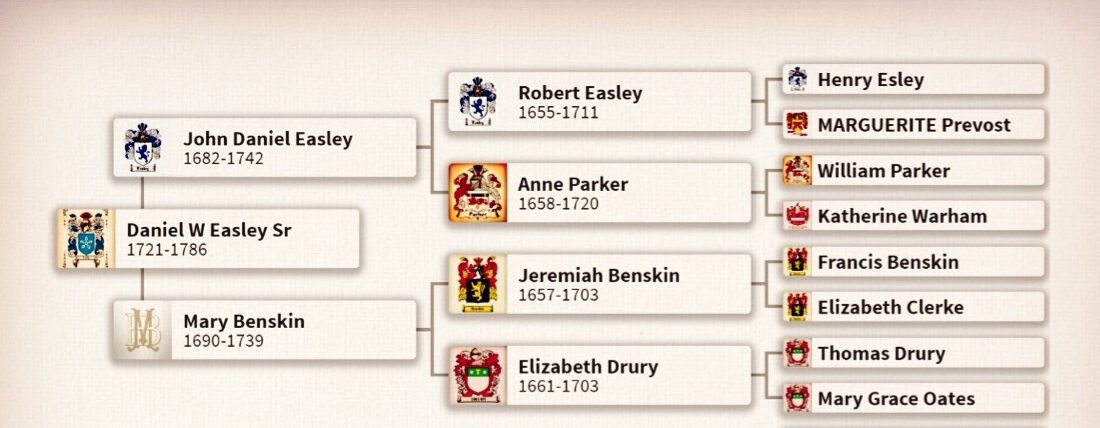The son of Robert Easley Sr and Ann Parker is my 9x great grandfather, John Daniel Easley Sr. He was born in Fine Creek, Virginia in 1682 and married Hillary Mary Benskin in 1711. They had one daughter and 7 sons.