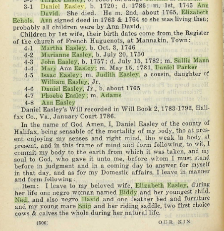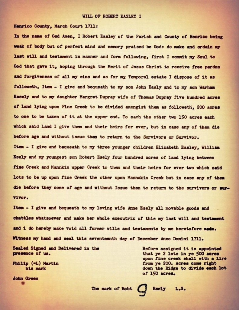 These protestant refugees farmed in Henrico county Virginia where, from the founding of the county, they used slaves to grow their crops. About 30 percent of the county were slaves stolen from their homes in Africa and forced to work in their fields and homes. Daniel Weldon Easley’s will bequeaths to his wife “one negro woman named Biddy and her youngest child, Ned and also negro David” along with a feather bed and a mare “in the name of God Amen”. He left a few other slaves to his remaining children and ordered the rest be sold on his death except for “old Dick” he ordered be left on the plantation “to be used well as long as he lives”. WikiTree lists a daughter of Daniel named Judith who was black, presumably from one of his slaves.